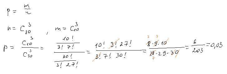 Из 30 учеников 10 умеют играть в шахматы. Какая вероятность того, что наугад выбраны три ученика умеют играть в шахматы?