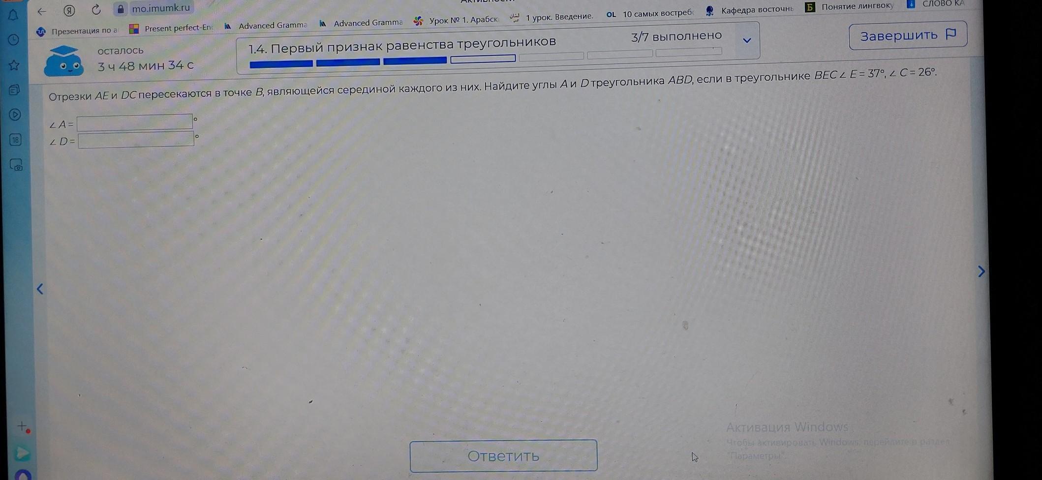 помогите пожалуйста!! Отрезки АЕ и DC пересекаются в точке В, являющейся серединой каждого из них. Найдите углы А и Д треугольника авс, если в треугольнике BEC угол Е равен 37°, угол С равен 26° .