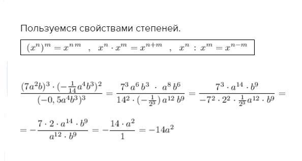 (7a²b)³×(-1/14a⁴b³)² = 7³a⁶b³×(1/14)²a⁸b⁶ = (7×7×7/14×14)a¹⁴b⁹ = 7/4 × a¹⁴b⁹ = 1 3/4 a¹⁴b⁹