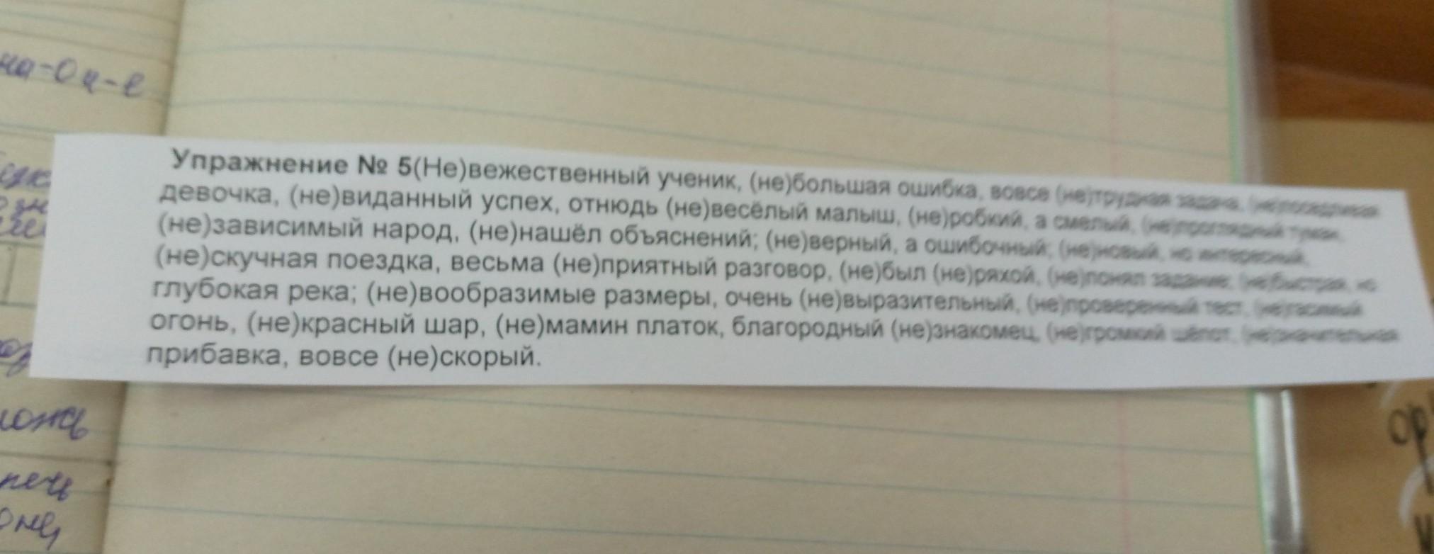Невежественный ученик, небольшая ошибка, вовсе не трудная задача, непоседливая девочка, невиданный успех, отнюдь не весёлый малыш, не робкий, а смелый, непроглядный туман, независимый народ, не нашёл объяснений, не верный, а ошибочный, не новый, но интересный, нескучная поездка, весьма не приятный разговор, не был неряхой, не понял задание, небыстрая, но глубокая река, невообразимые размеры, очень невыразительный, непроверенный текст, негасимый огонь, не красный шар, не мамин платок, благородный незнакомец, негромкий шёпот, незначительная прибавка, вовсе не скромный