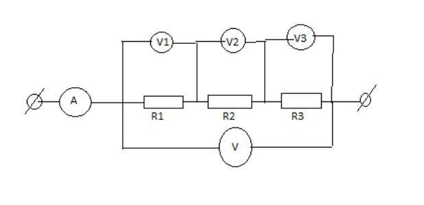 Вольтметр V1 показує напругу 8 В. Опір першого провідника R1= 8 Ом, другого R2 = 4 Ом, третього R3 = 2 Ом. Які покази амперметра А i вольтметрів V2, V3, V?