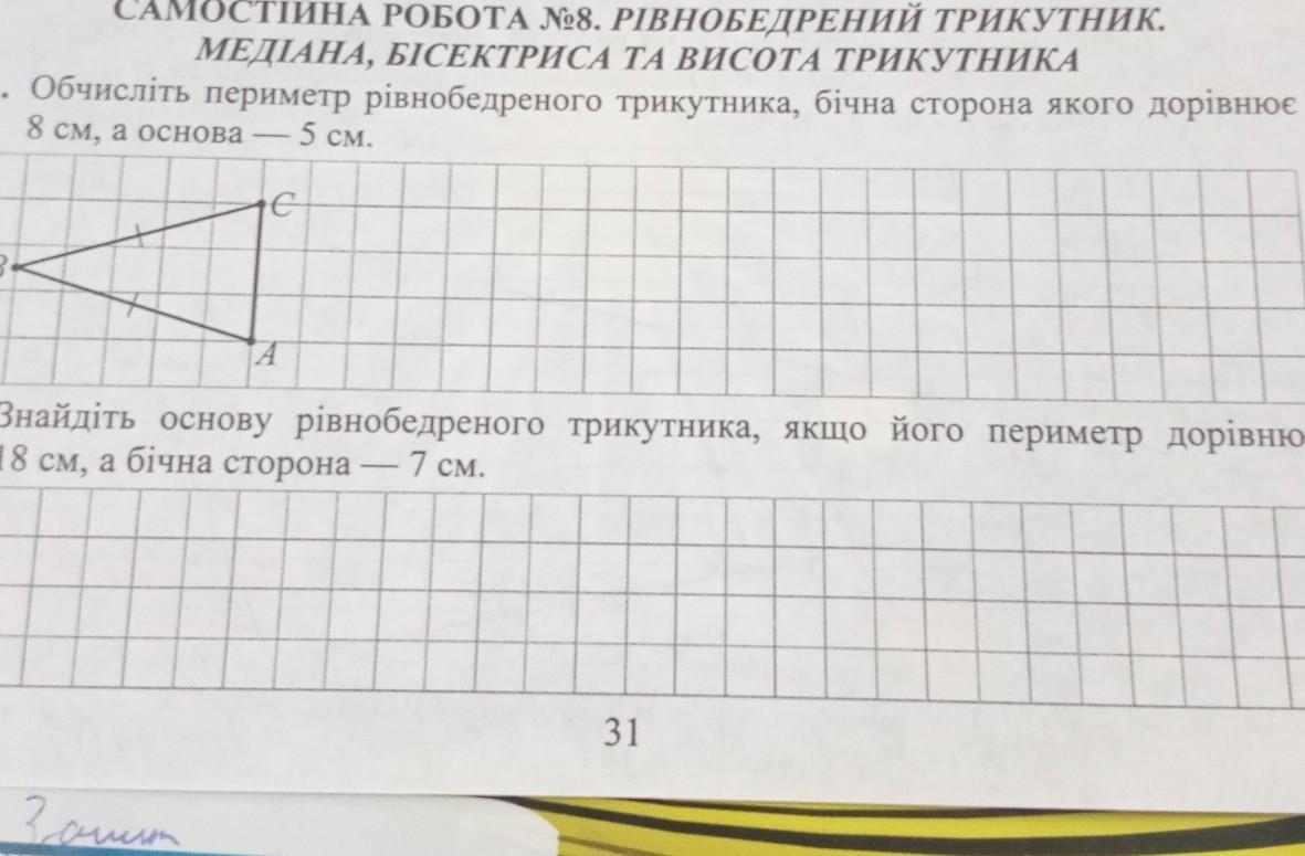 Обчисліть периметр рівнобедреного трикутника, бічна сторона якого дорівнює 8 см, а основа—5 см