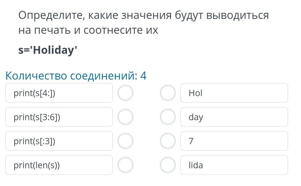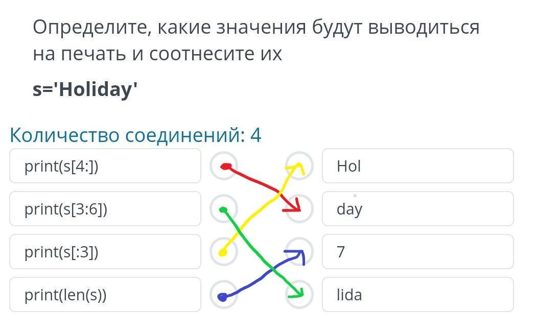 Определите, какие значения будут выводиться на печать и соотнесите их s='Holiday'