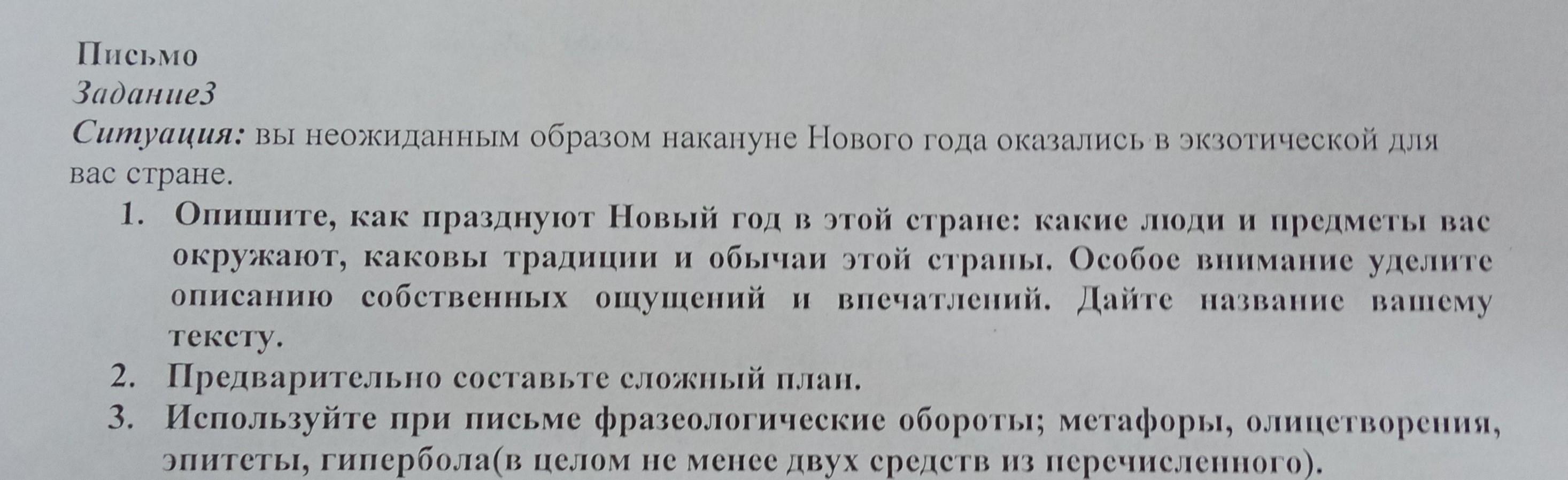 Письмо Задание3 Ситуация: вы неожиданным образом накануне Нового года оказались вкзотической для вас стране. 1. Опишите, как празднуют Новый год в этой стране: какие лоди и предметы вас окружают, каковы традиции и обычаи этой страны. Особое внимание уделите описанию собственных ощущений и впечатлений. Дайте название вашему тексту. 2. Предварительно составьте сложный план. 3. Используйте при письме фразеологические обороты; метафоры, олицетворения, эпитеты, гипербола(в целом не менее двух средств из перечисленного). Помогите пожалуйста )