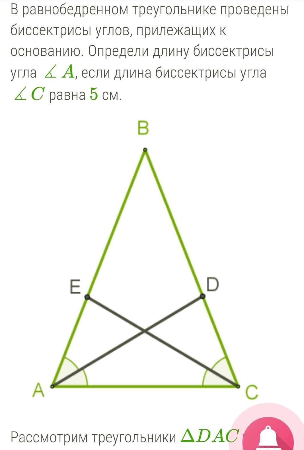 Решение: треугольники АDC и СЕА равны, поэтому соответственные элементы равны, и биссектрисы (стороны треугольников) тоже равны.