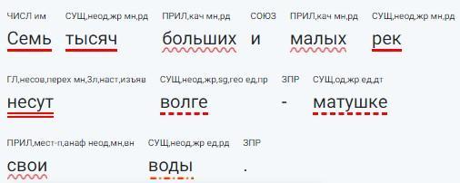 синтаксический разбор предложения. Семь тысяч больших и малых рек несут волге-матушке свои воды.