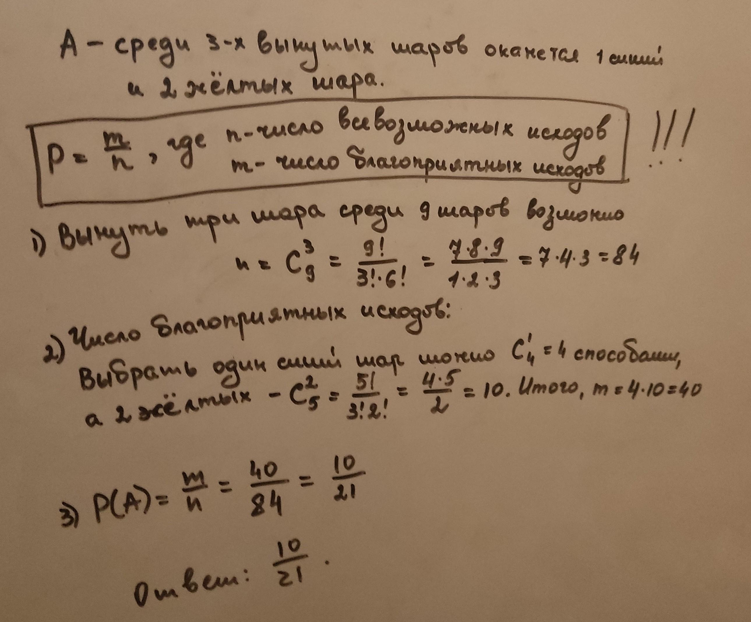 в ящике лежат 5 желтых и 4 синих шара. Наудачу вытаскивают 3 шара. а) какова вероятность, что один окажется синий и 2 желтых шара?