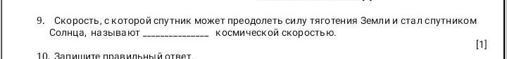 9.Скорость,с которой спутник может преодолеть силу тяготения Земли и стал спутником Солнца, называют_________ космической скоростью.