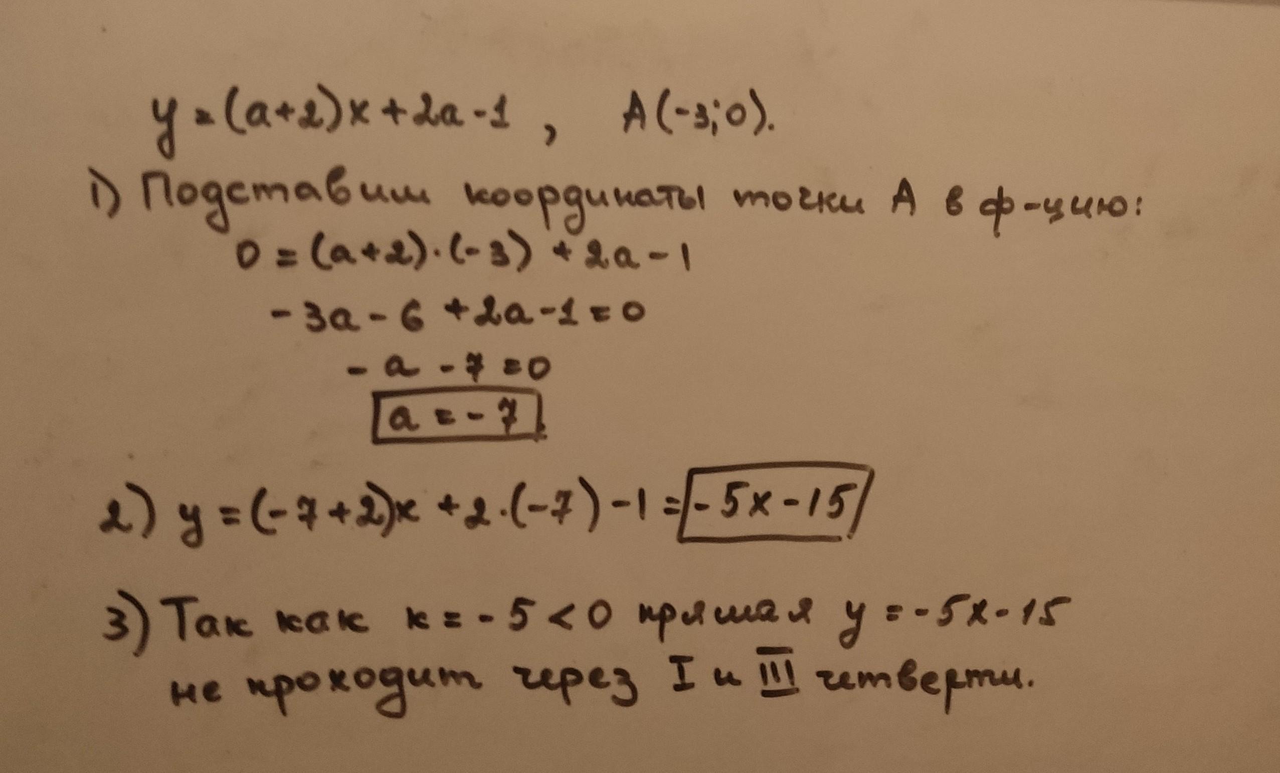 график функции, заданной уравнением у=(а+2)х+2а-1 пересекает ось абсцисс в точке с координатами (-3;0)