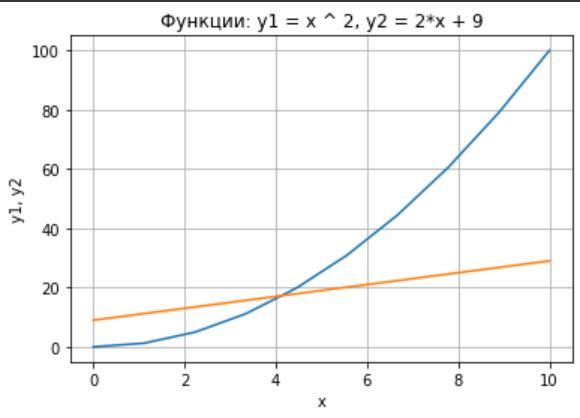 y1 задаем с помощью list comprehension как квадратичную зависимость, y2 зададим просто как 2*x + 9