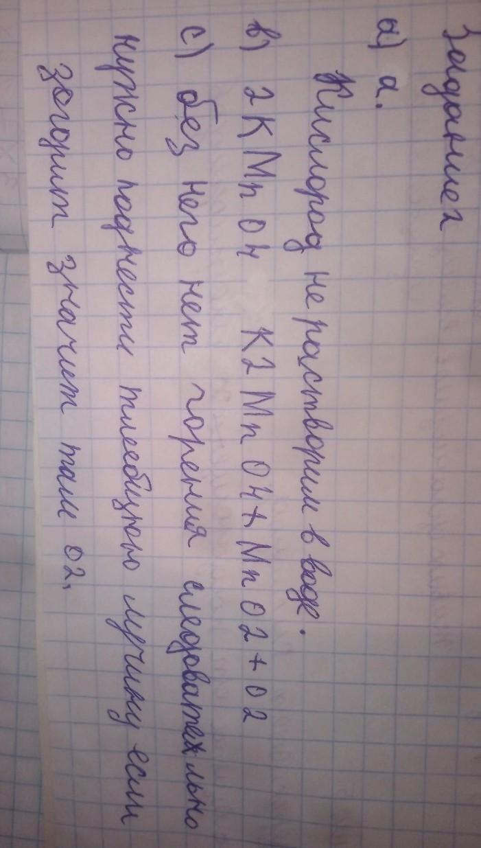 (а) Какими способами можно собрать кислород? Ответ обоснуйте. (b) Запишите уравнение реакции получения кислорода разложением перманганата калия. (с) Докажите, что в задании 2(а) образуется кислород