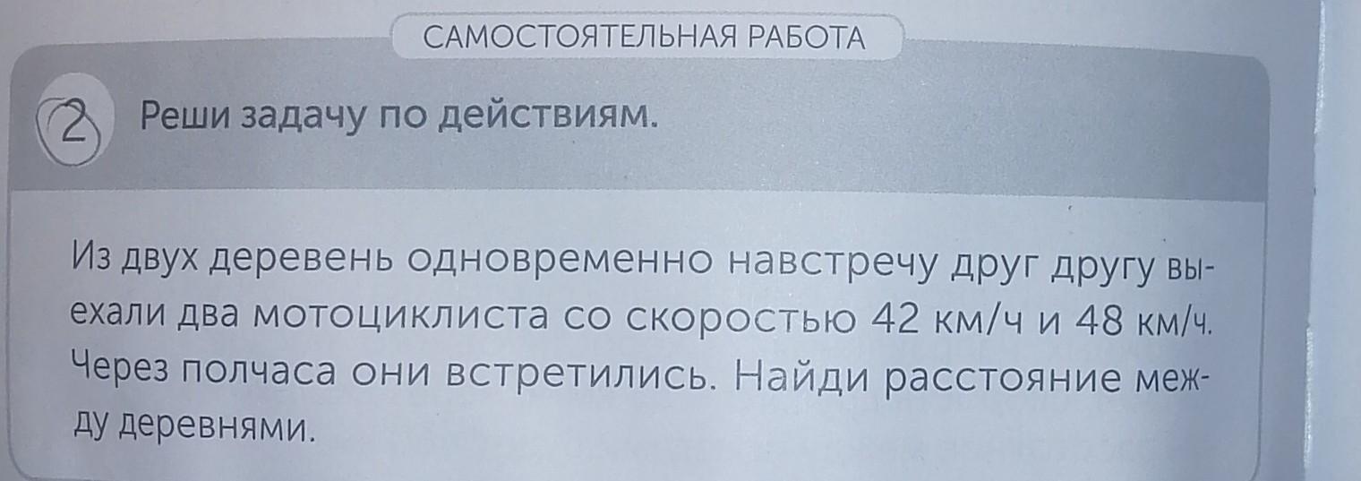 САМОСТОЯТЕЛЬНАЯ РАБОТА 2. Реши задачу по действиям. Из двух деревень одновременно навстречу друг другу вы- ехали два мотоциклиста со скоростью 42 км/ч и 48 км/ч. Через полчаса они встретились. Найди расстояние меж- ду деревнями.