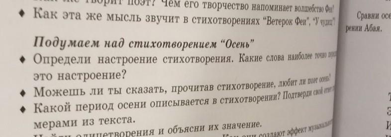 It Ла же мысль звучит в стихотворениях "Ветерок фен, 10 Творчество напоминает волшеу Сравни рении Абая Подумаем над стихотворением “Осень" • Определи настроение стихотворения. Какие слова наиболее это настроение? • Можешь ли ты сказать, прочитав стихотворение, любит ли по и • Какой период осени описывается в стихотворении? Подтверди зі не мерами из текста. объясни их значение.