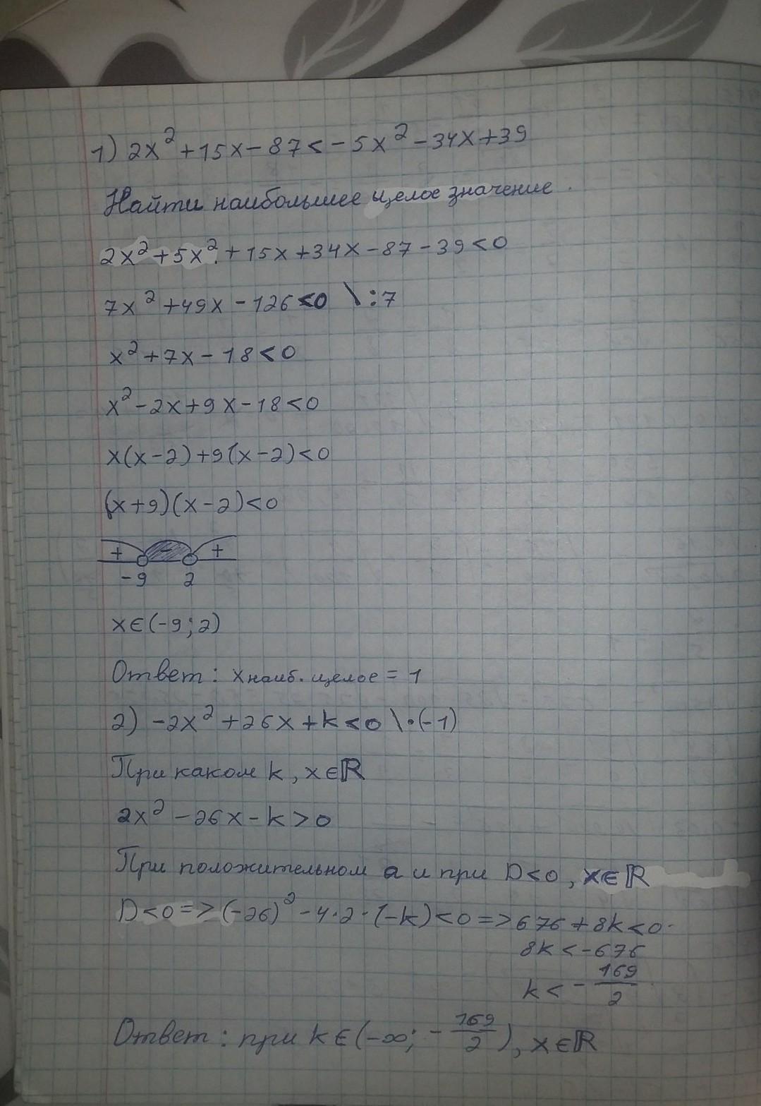 1) Определи наибольшее целое значение, при котором неравенство имеет решение: 2х^2 + 15x - 87<- 5x^2-34х + 39