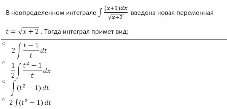 Підставимо в інтеграл : ∫ ( x + 1 )dx/√ ( x + 2 ) = ∫( t² - 1 )2tdt/t =