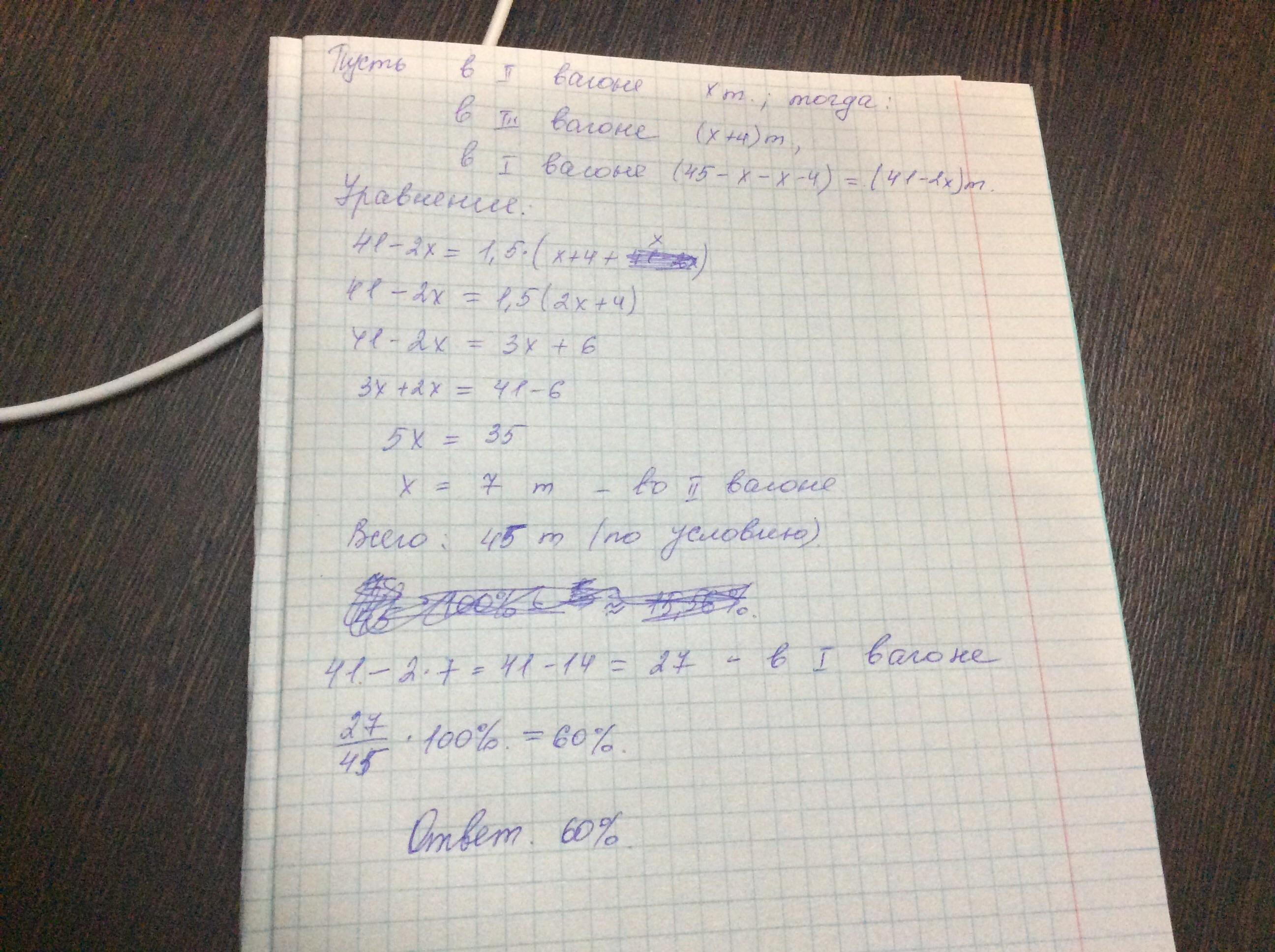 В трёх вагонах находится 45 т зерна. Во втором вагоне на 4 т меньше, чем в третьем. А в первом вагоне в 1,5 раза больше, чем во втором и третьем вместе. Определи, какой процент составляет вес зерна в первом вагоне.