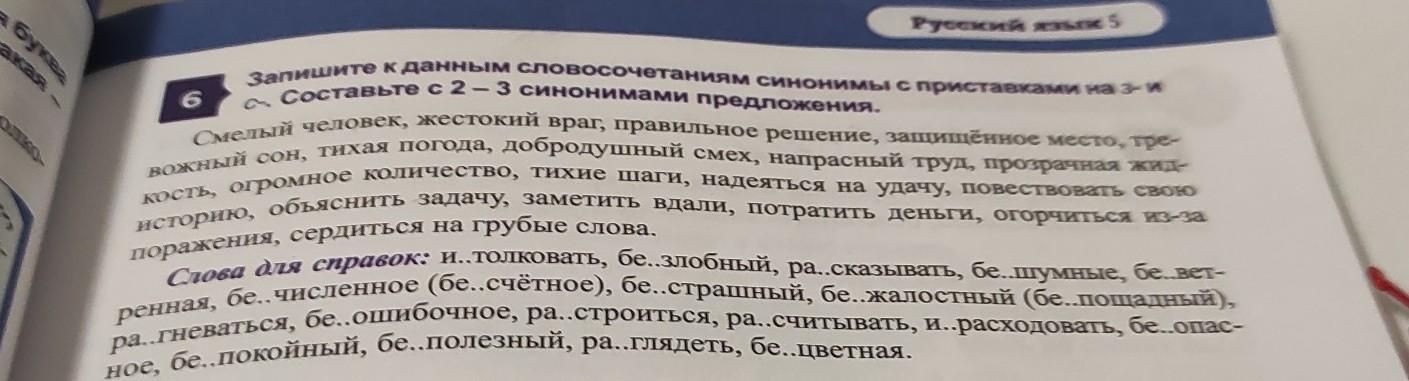 Запишите к данным словосочетаниям синонимы с приставками на » Составьте с 2-3 синонимами предложения смелый человек, жестокий враг правильное решение, защищённое место, тре- вожный сон, тихая погода, добродушный смех, напрасный труд, прозрачная жі Кость, огромное количество, тихие шаги, надеяться на удачу, повествовать свою историю, объяснить задачу, заметить вдали, потратить деньги, огореться з-за поражения, сердиться на грубые слова. Слова для справок: и толковать, безлобный, рассказывать, бешумные, бе вет- ренная, бе..численное (бе..счётное), бе.. страшный, бежалостный (беспощадный), ра..Гневаться, бе..ошибочное, растроиться, расчитывать, и расходовать, беотас- ное, бе..покойный, бе..полезный, ра..Глядеть,