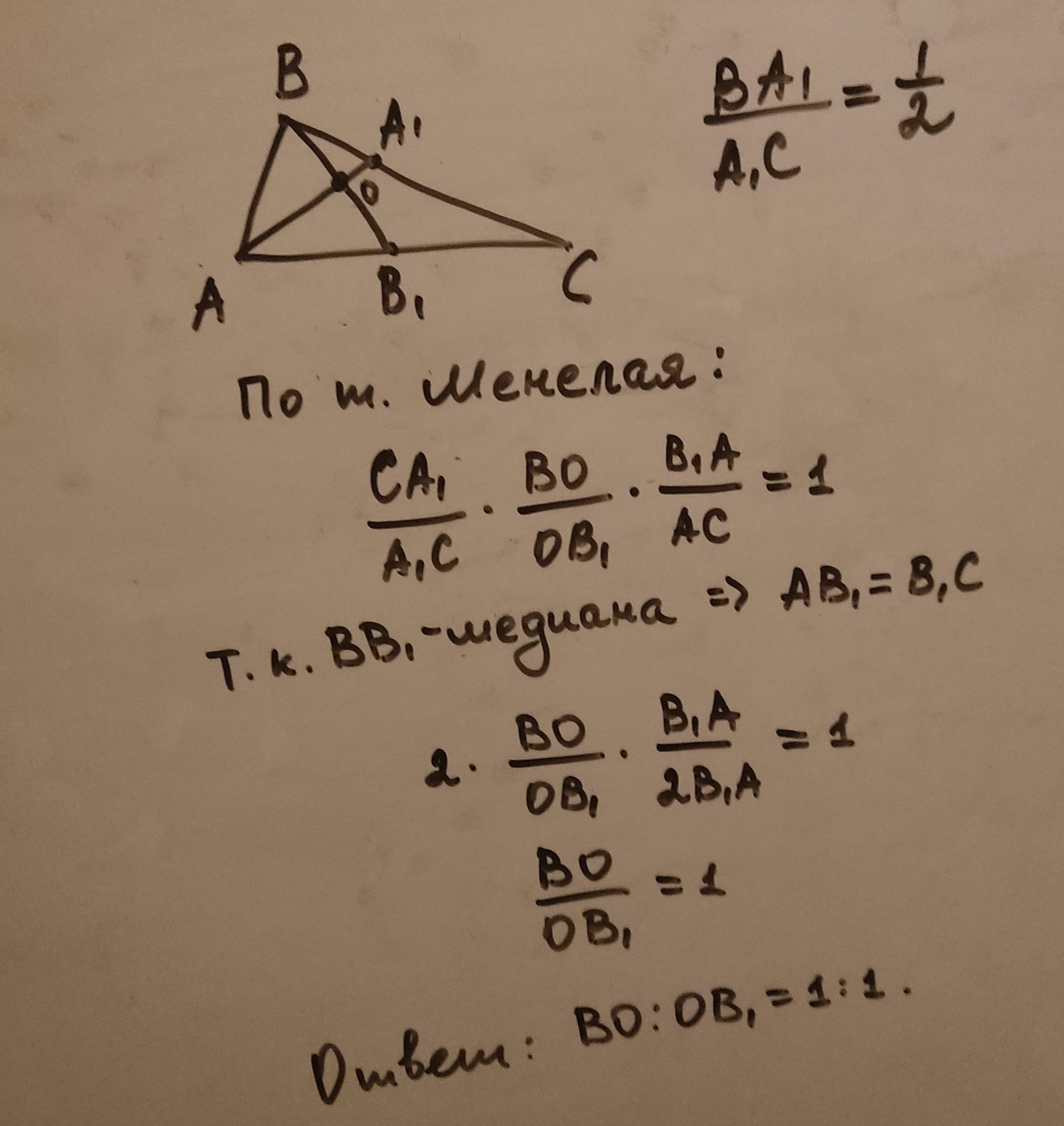 1. Точка A1 делит сторону BC треугольника ABC в отношении BA1 : A1C = 1 : 2. В каком отношении отрезок AA1 делит медиану BB1?
