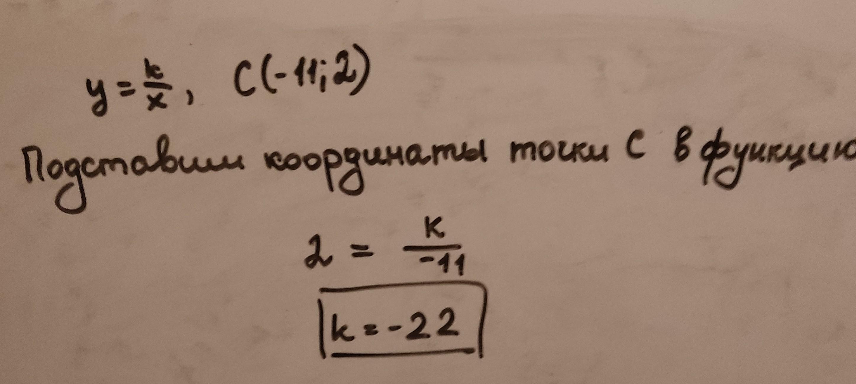найдите значение коэффициента к если известно что график функции у=к/х проходит через точку с кординатоми C(-11:2)