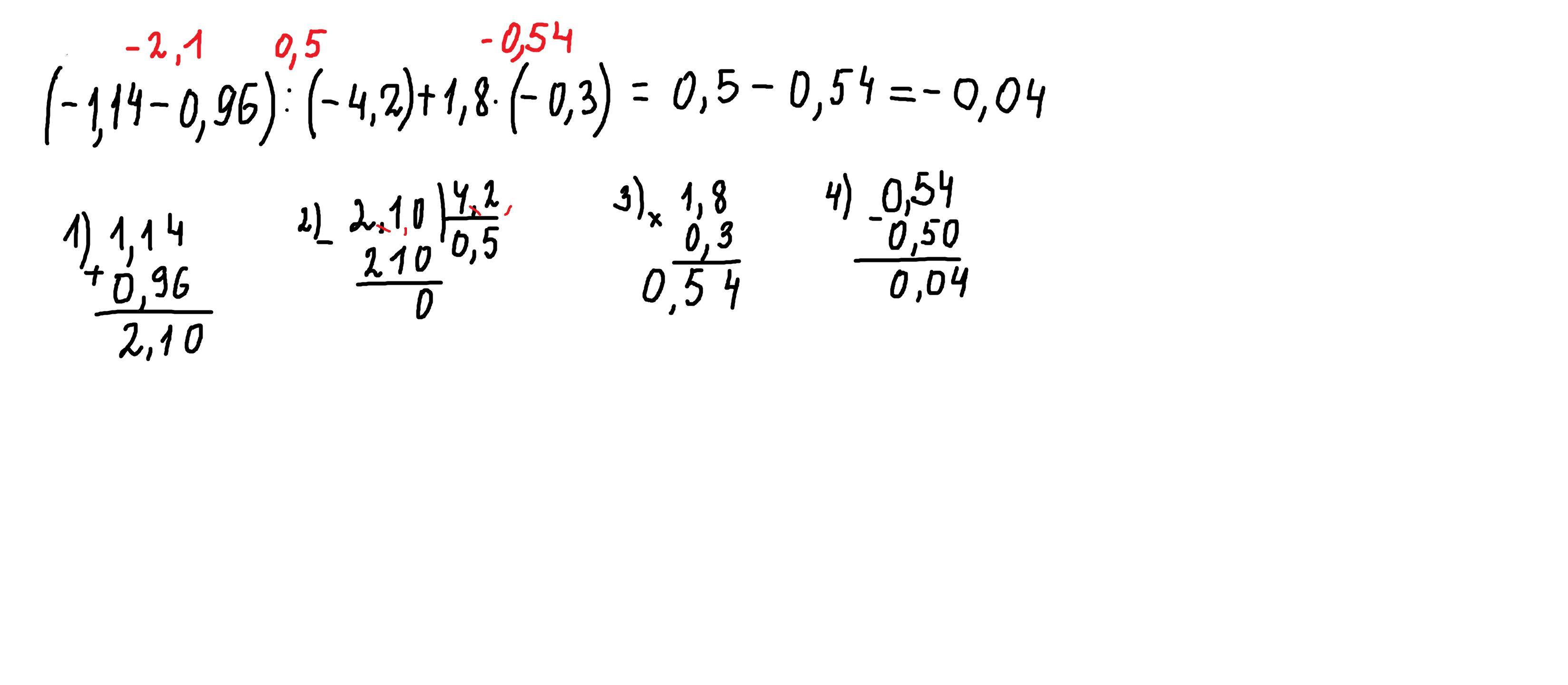(-1,14-0,96):(-4,2)+1,8*(-0,3)=-2,1:(-4,2)-0,54=0,5-0,54=-0,04