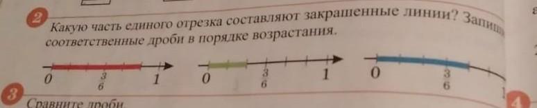 все отрезки разделены на 6 равных частей.красным закрашено 5 таких частей,т.е 5/6 отрезка.Зеленым закрашено 2 такие части,т.е 2/6 отрезка,а синим 4 части,т.е 4/6 отрезка.