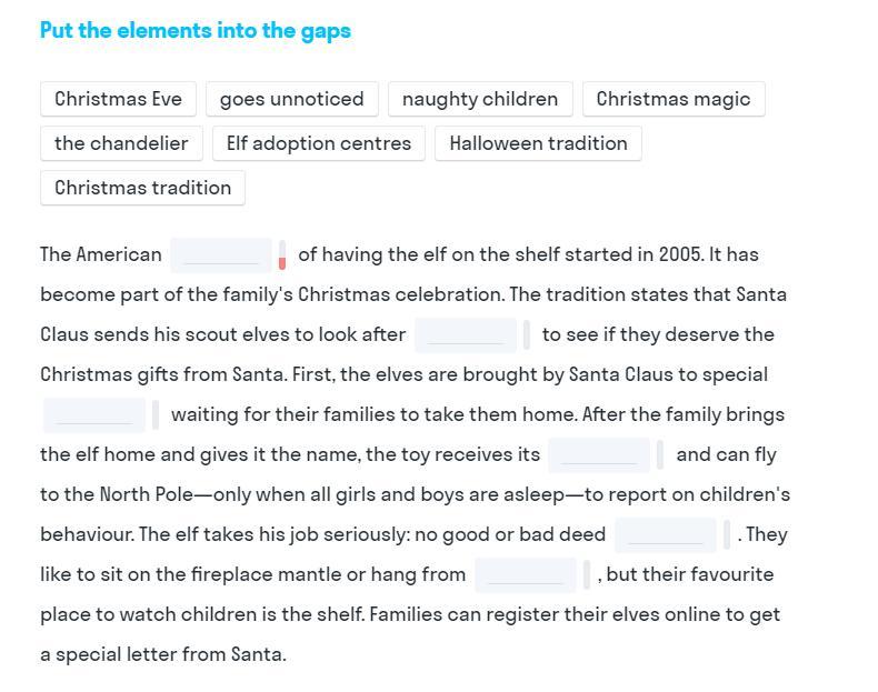 The American Christmas tradition of having the elf on the shelf started in 2005. It has become part of the family's Christmas celebration. The tradition states that Santa Claus sends his scout elves to look after naughty children to see if they deserve the Christmas gifts from Santa. First, the elves are brought by Santa Claus to special Elf adoption centres waiting for their families to take them home. After the family brings the elf home and gives it the name, the toy receives its Christmas magic and can fly to the North Pole - only when all girls and boys are asleep - to report on children's behaviour. The elf takes his job seriously: no good or bad deed goes unnoticed. They like to sit on the fireplace mantle or hang from the chandelier, but their favourite place to watch children is the shelf. Families can register their elves online to get a special letter from Santa.