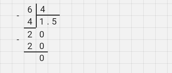 Объяснение этого решения в столбик: Сначала 6 мы делим на 4, это будет 1 и 2 в остатке. Потом мы к 2 приписываем 0, Но не забываем там где ответ поставить запятую. Дальше у нас 20, 20 делим на 4 будет 5, записываем 5 в ответ. 20 • 5 = 20, Значит 20 - 20 = 0. Всё, мы решение сделали, ответ у нас 1,5.