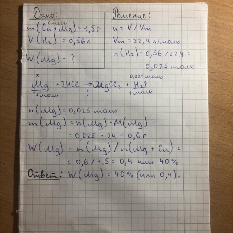 Смесь медных и магниевых опилок массой 1,5 г обработали избытком соляной кислоты. В результате реакции выделился водород объёмом 0,56 л (н. у.). Определи массовую долю магния в смеси (в %).