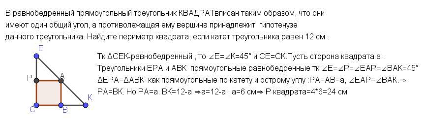 В равнобедренный прямоугольный треугольник вписан КВАДРАТ таким образом, что они имеют один общий угол, а ПРОТИВОЛЕЖАЩАЯ ему вершина принадлежит гипотенузе данного треугольника. Найдите периметр квадрата, если катет треугольника равен 12 см.