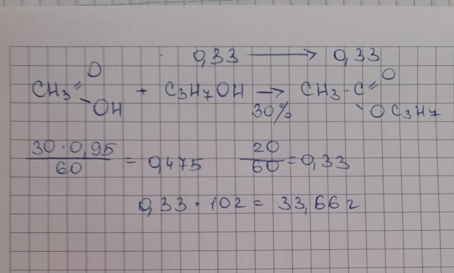 Найдите массу уксуснопропилового эфира, образующегося при взаимодействии 20 г пропилового спирта и 30 г раствора уксусной кислоты, массовая доля кислоты в котором составляет 95%, если выход эфира составил 30%.