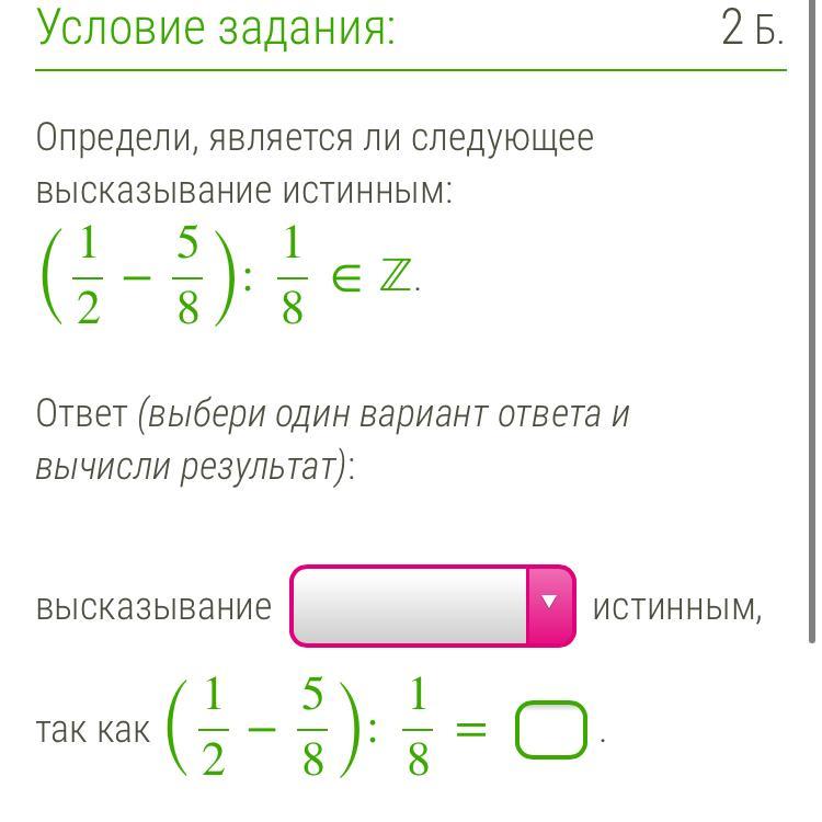 Ответ: высказывание (1/2-5/8):(1/8)∈Zявляется истинным.