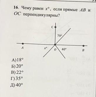 16. Чему равен х°, если прямые AB и ОС перпендикулярны? с! 70° А о 40° B А)18° Б) 20° B) 22° Г) 35° Д) 40°