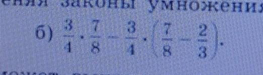 Сначала вычисляет то, что в скобках:1.) 7/8-2/3=21/24-16/24=5/24Затем умножение которое идет первее всех. 2.) 3/4 * 7/8 = 21/32 3.) 3/4 * 5/24 = 5/324.) 21/32-5/32 = 16/32 = 2/4 = 1/2(ответ)Надеюсь помогла❤️