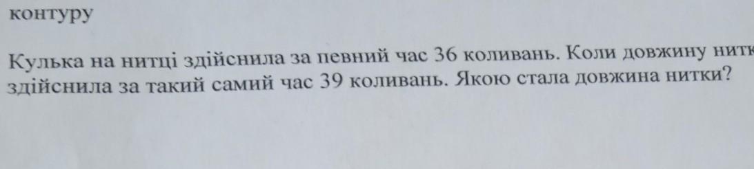 где N есть число совершённых колебаний, t - время, за которое эти колебания совершились, l - длина маятника (нитки), g - ускорение свободного падения. В вашем случае нужно рассмотреть две разных формулы: с первоначальными значениями: N1=36, и с новыми: N2=39