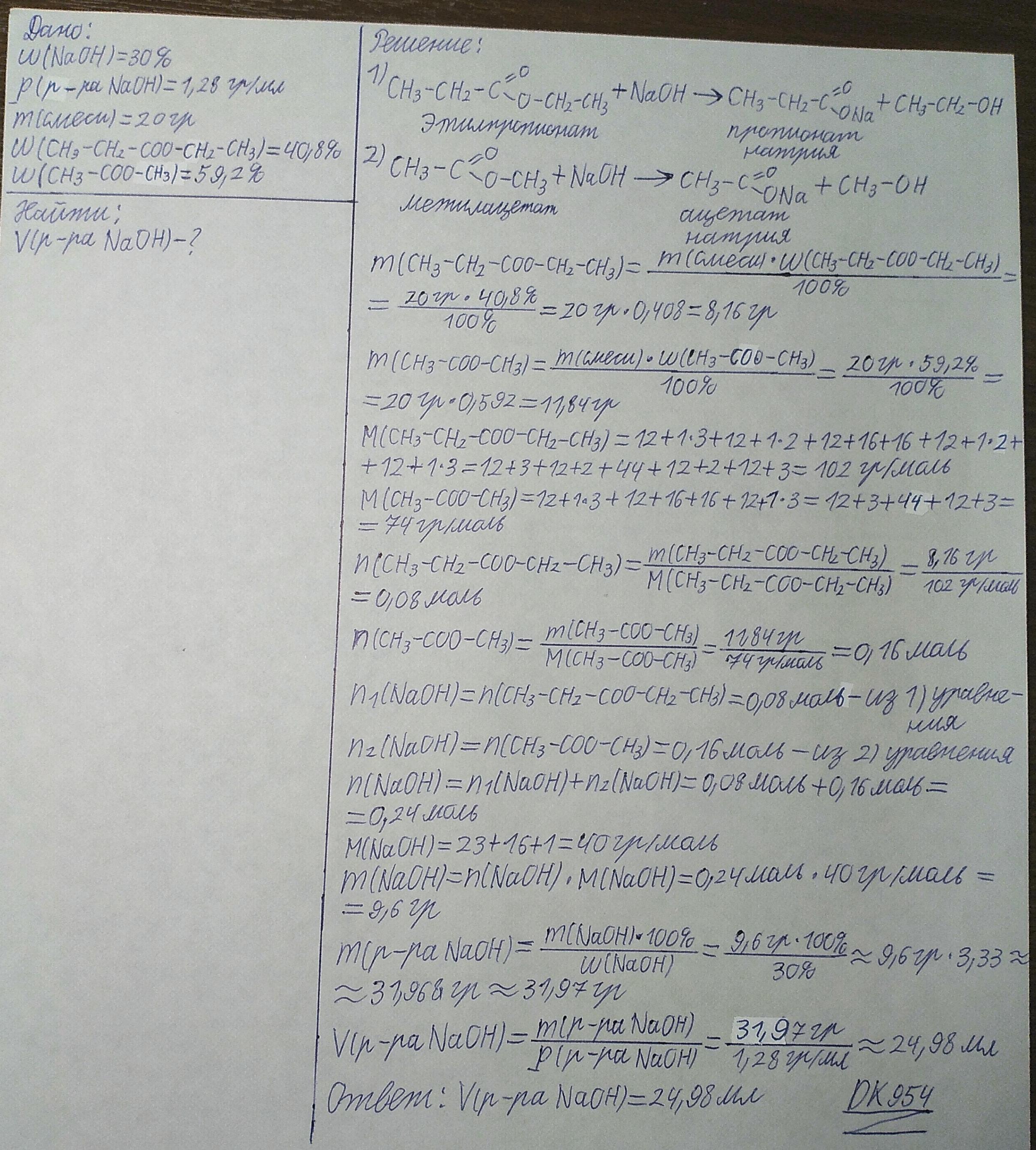 какой обьем гидроксида натрия с массовой долей 30%(p=1,28г/мл)потребуется для полного щелочного гидролиза 20г смеси эфиров,состоящей из 40,8% этилпропионата и 59,2% метилацетата