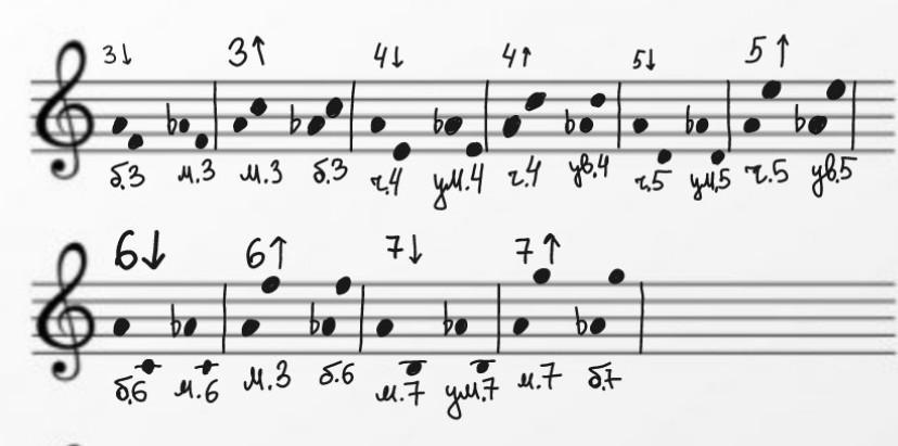 В образце уже написаны и подписаны секунды, терции нужно подписать. Остальные интервалы сделать самостоятельно.