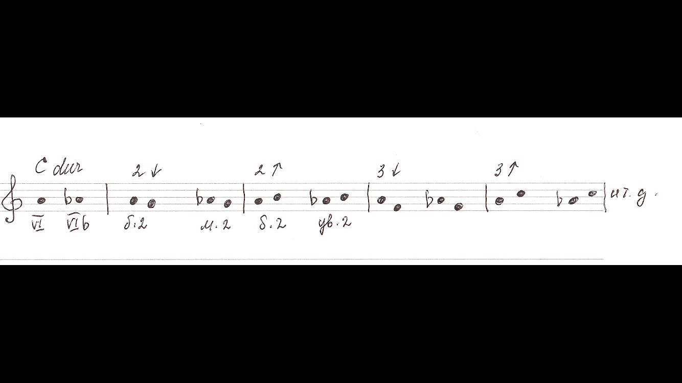 В тональности C -dur натуральном и гармоническом выписать в нотную тетрадь все интервалы в которых есть VI ступень. При построении интервала вверх VI ступень будет основанием интервала, а при построении интервала вниз VI ступень будет вершиной интервала.