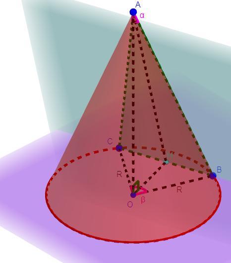 Дано: OC = OB = R, ∠BOC = β, ∠BAC = α, O - центр окружности в основании конуса