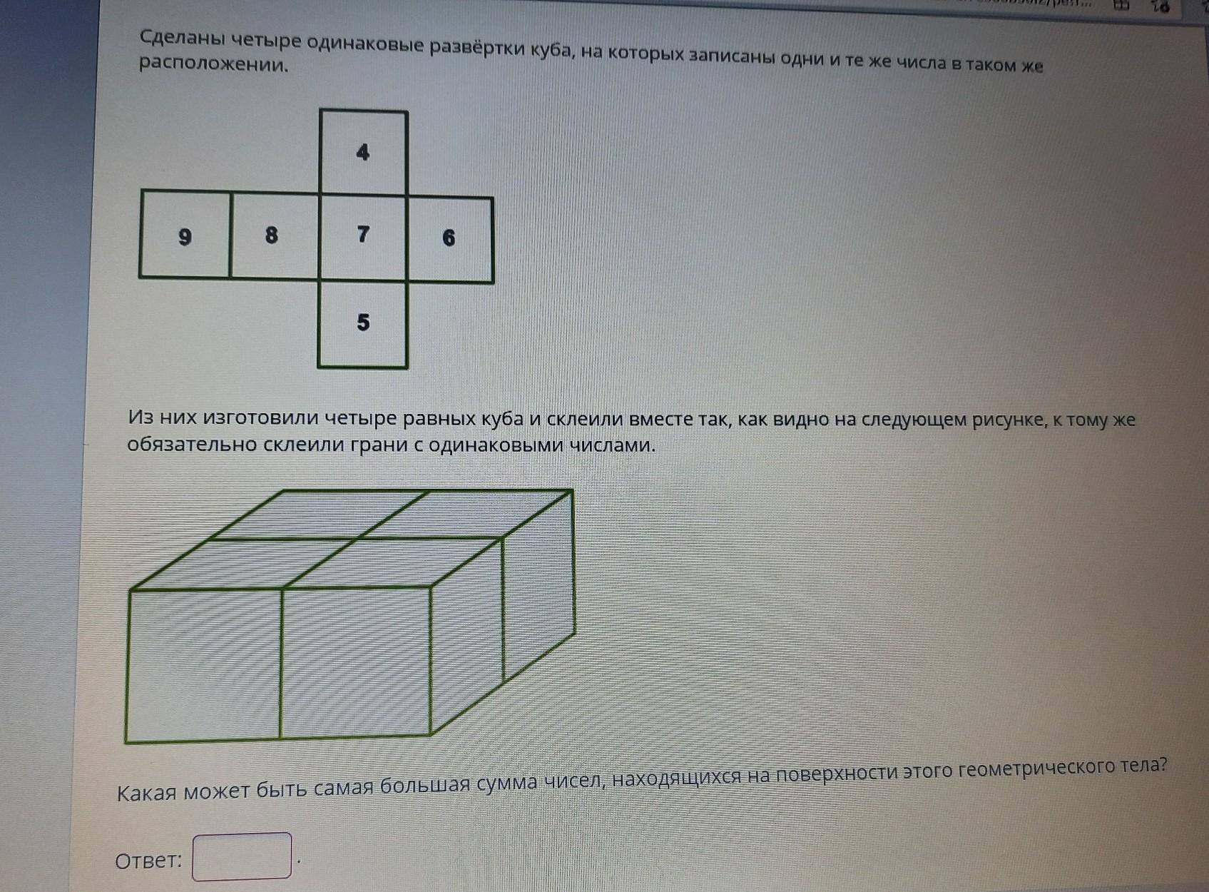 Ответ:самая большая сума чисел, находящихся на поверхности этого геометрического тела 120.