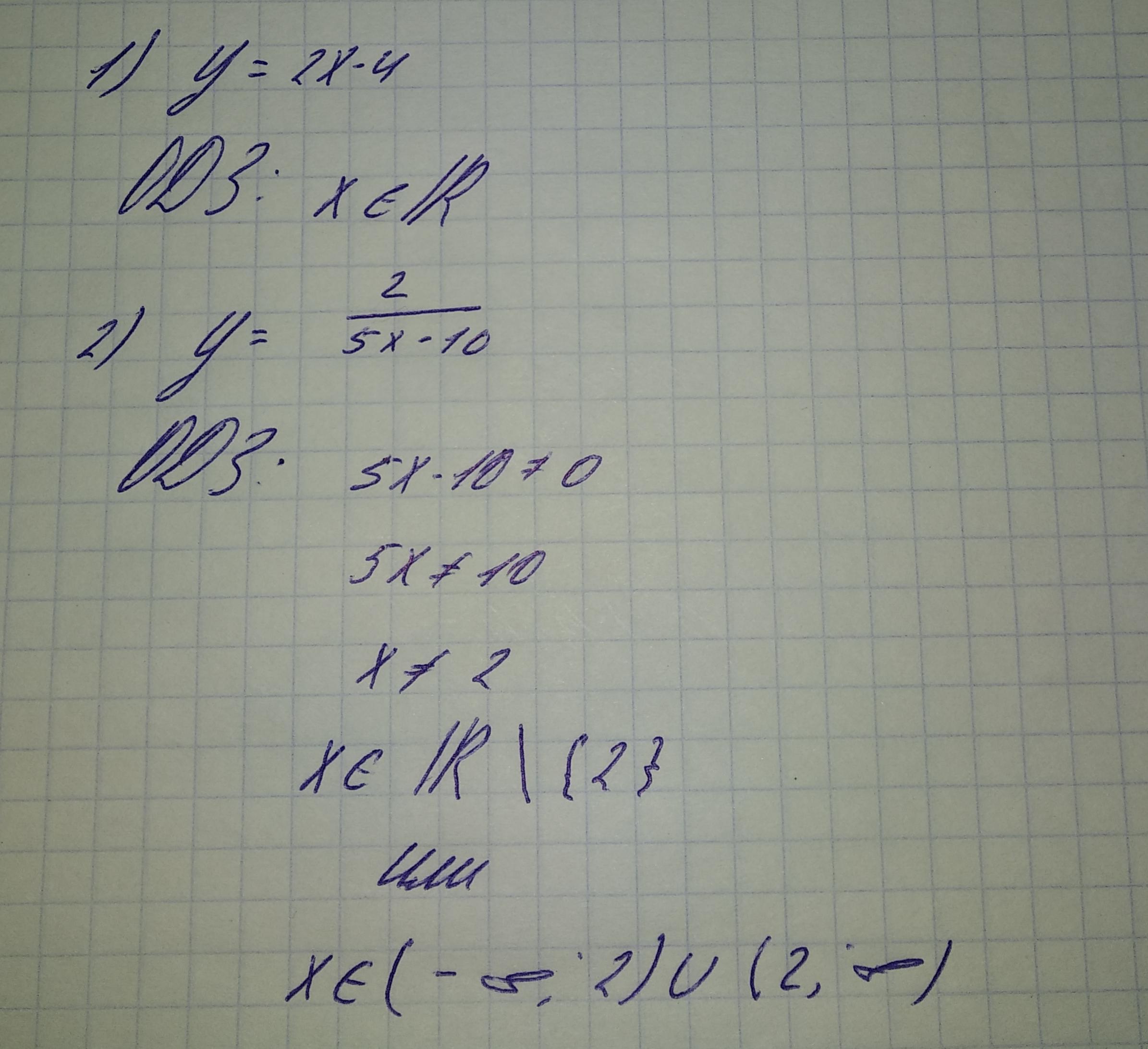 5. найдите область определения функции, заданной формулой: 2 1) y = 2x - 4 ; 2) y = = 5x-10 помогите