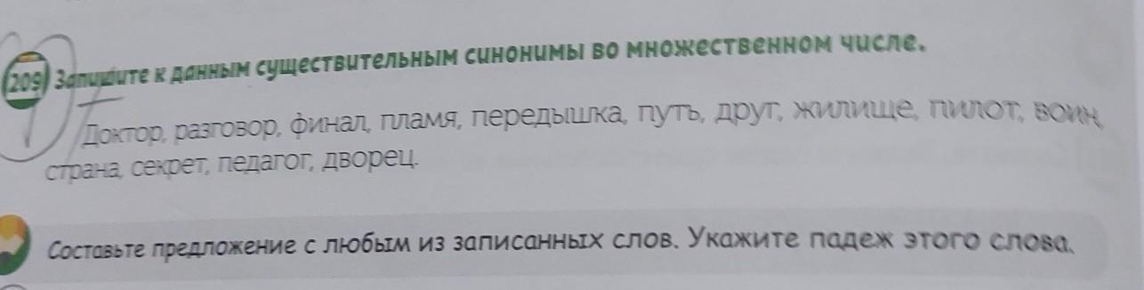 Запишите к данным существительным синонимы во множественном числе /Доктор, разГОВор, Финал, Пламя, передышка, путь, друг, ЖИЛИще, ПИЛОТ, ВОИН, страна, секрет, педагог, дворец. Составьте предложение с любым из записанных слов. Укажите падеж этого слова.