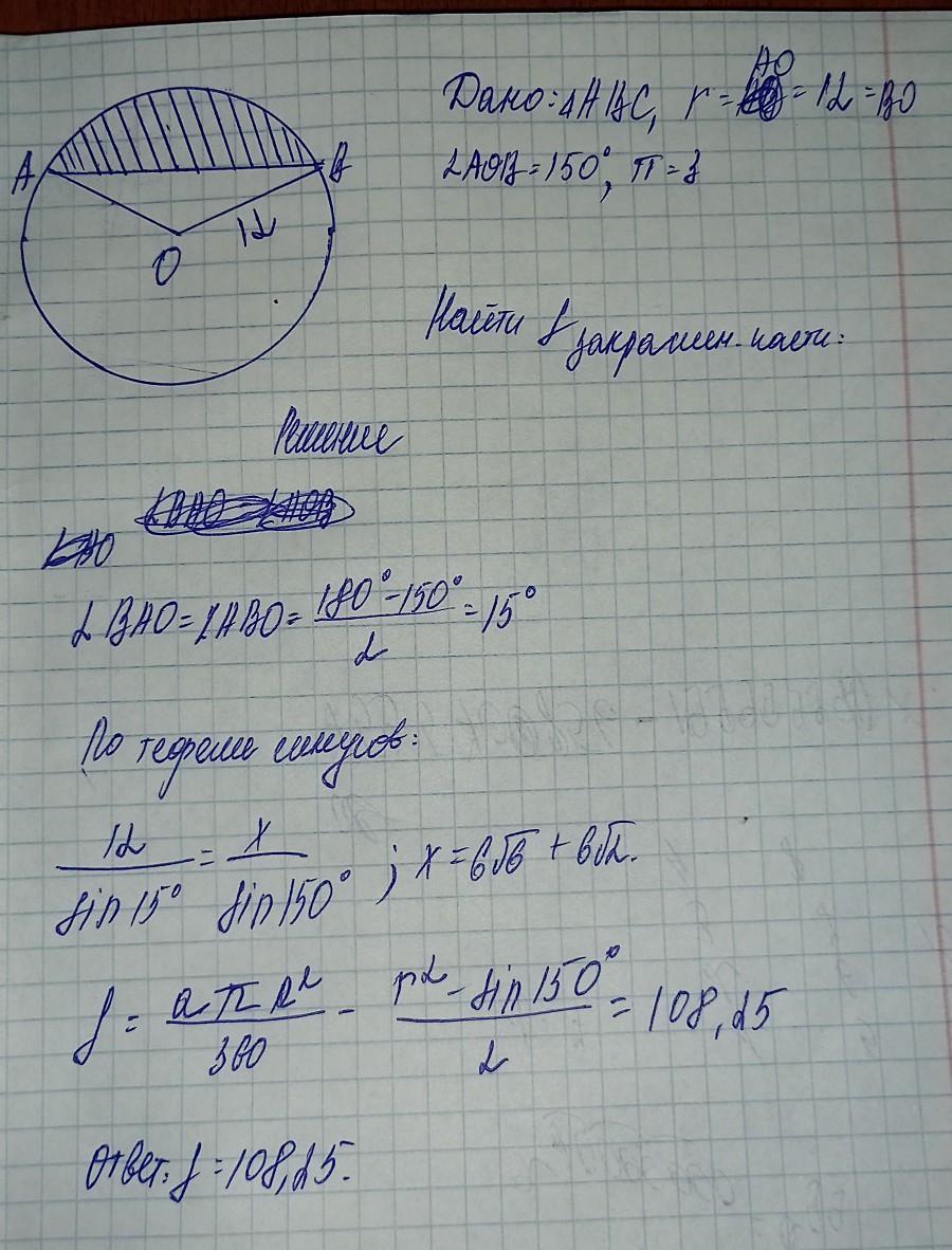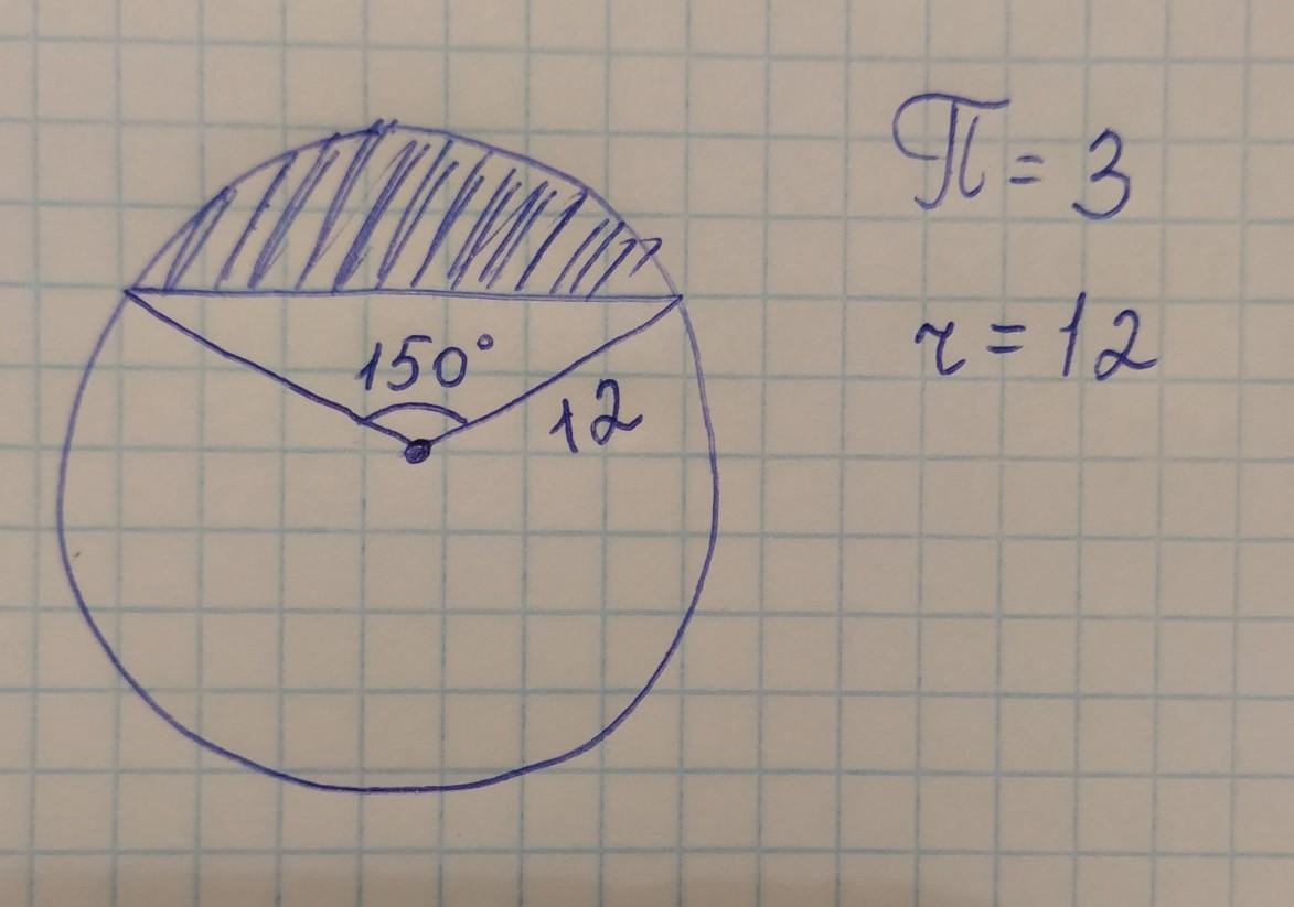 Найдите площадь заштрихованного сегмента круга (П=3)