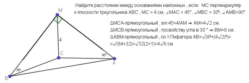 МС = 4 см, кут МАС = 45°, кут МВС = 30º, кут АMB - прямий кут. Знайдіть відстань між основами похилих.