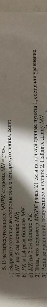 2) Зная, что периметр MNPK равен 21 см и используя данные пункта 1, составьте уравнение.