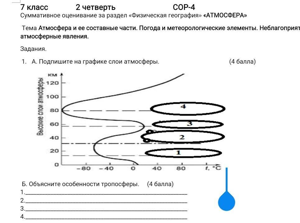 А. Подпишите на графике слои атмосферы. (4 балла) Б. Объясните особенности тропосферы. (4 балла) 1.__________________________________________________________ 2.__________________________________________________________ 3.__________________________________________________________ 4.__________________________________________________________