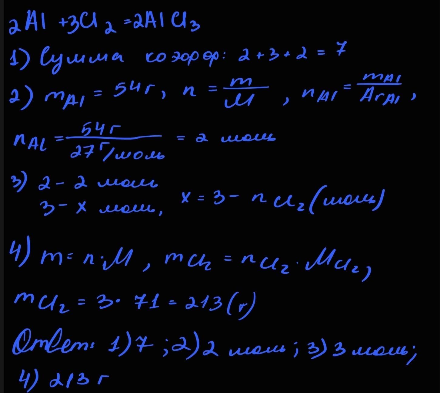 54 г алюминия вступают в реакцию с избытком хлора с образованием хлорида алюминия.