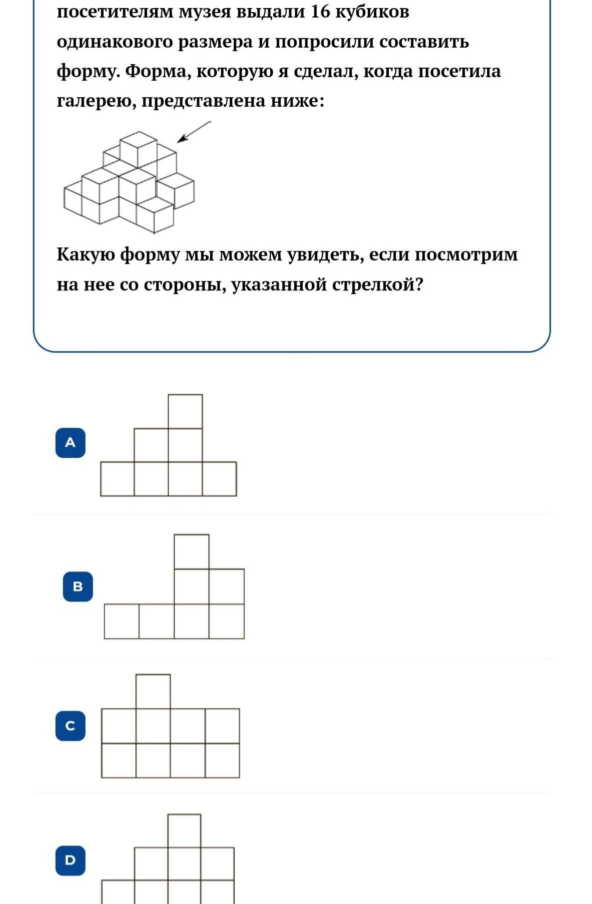 если смотреть по левому краю, там видно что вначале идет один кубик, потом лесенкой два, потом три, а потом сзади самого верхнего кубика(в 3д) мы видим то что там точно есть два кубика -> справа на проекции должно быть два кубика
