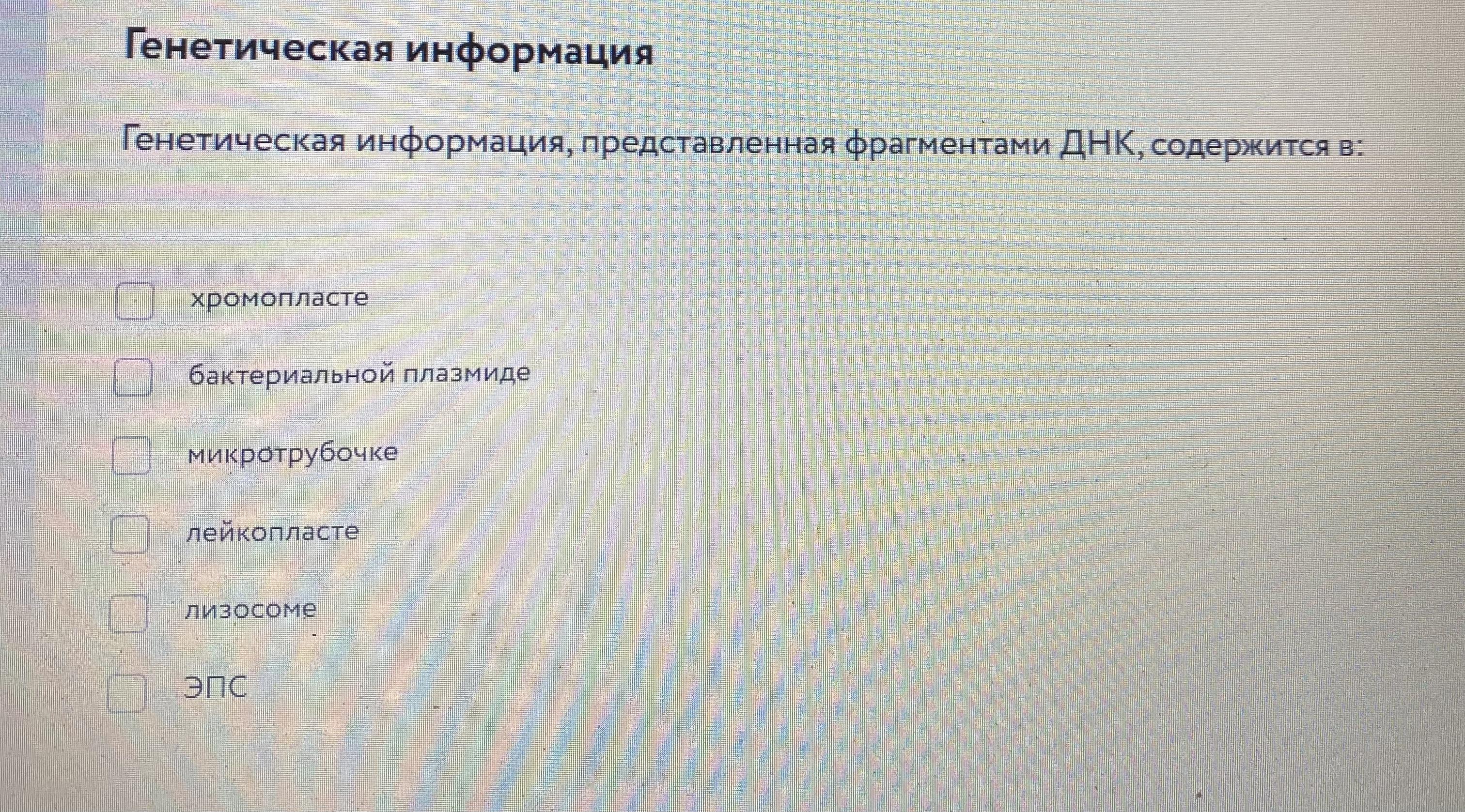 Генетическая информация, представленная фрагментами ДНК содержится в: хромопласте, бактериальной плазмиде, лейкопласте.