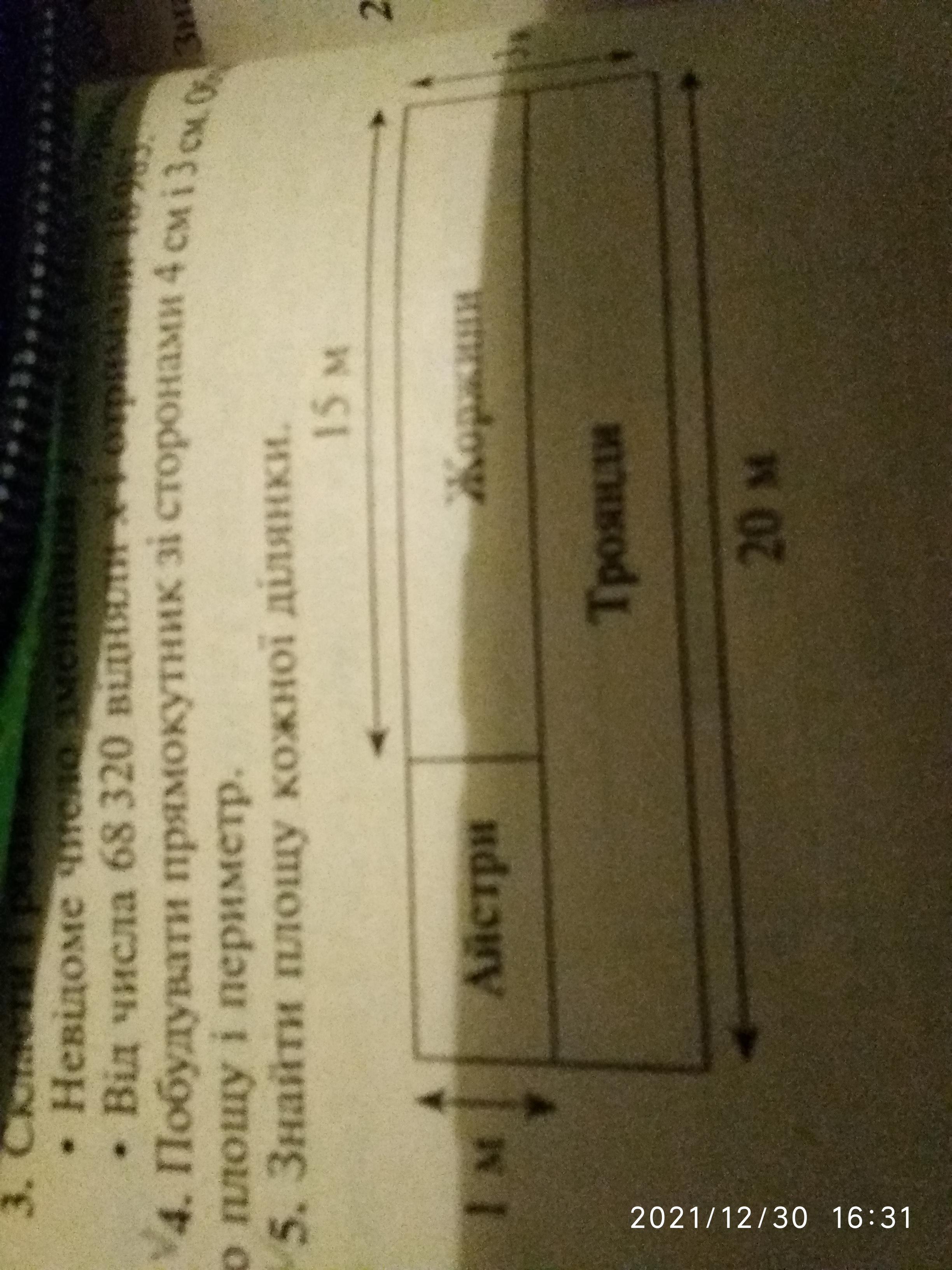 1) 20-15=5 (м) - ширина ділянки з айстрами