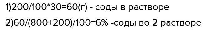 Смешивали 800 грамм воды в первом стакане и 200 грамм раствора соды с концентрацией 30% во втором стакане. Сколько процентов образовавшегося раствора составляет сода?